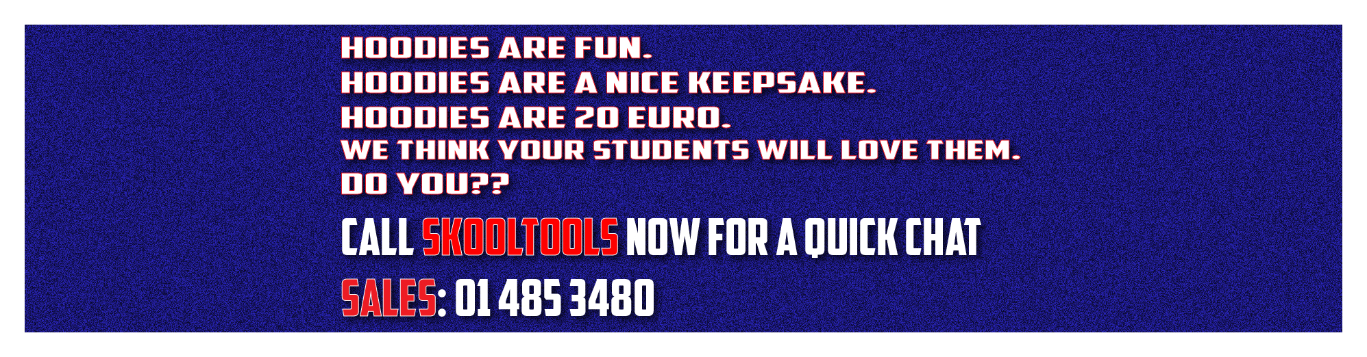 At Skooltools, We areexperts in Graduation Hoodies. We supply primary and secondary schools all over Ireland with customized hoodie style clothing for their graduation classes. Continully we aim to offergreat service price and qualitywhile always keeping the ordering process as easy as possible. Rest assured you can order with us with the added confidence of knowingyou will end up with a great productfor your students.